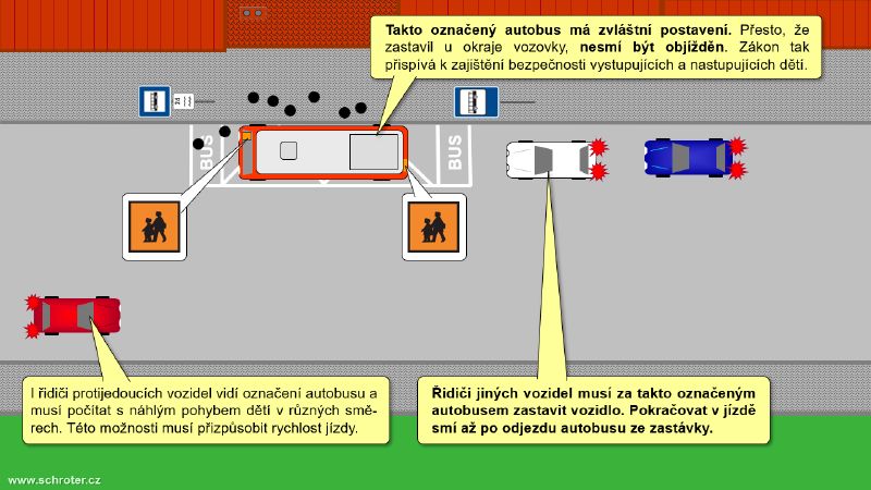 "Za autobusem s označením „Označení autobusu přepravujícího děti“, který zastavil v označené zastávce, musí řidič jiného vozidla zastavit vozidlo. Pokračovat v jízdě může až po odjezdu autobusu ze zastávky. Řidiči protijedoucích vozidel musí přihlédnout k možnosti vběhnutí dětí do vozovky a jízdu přizpůsobit tak, aby děti nebyly ohroženy."